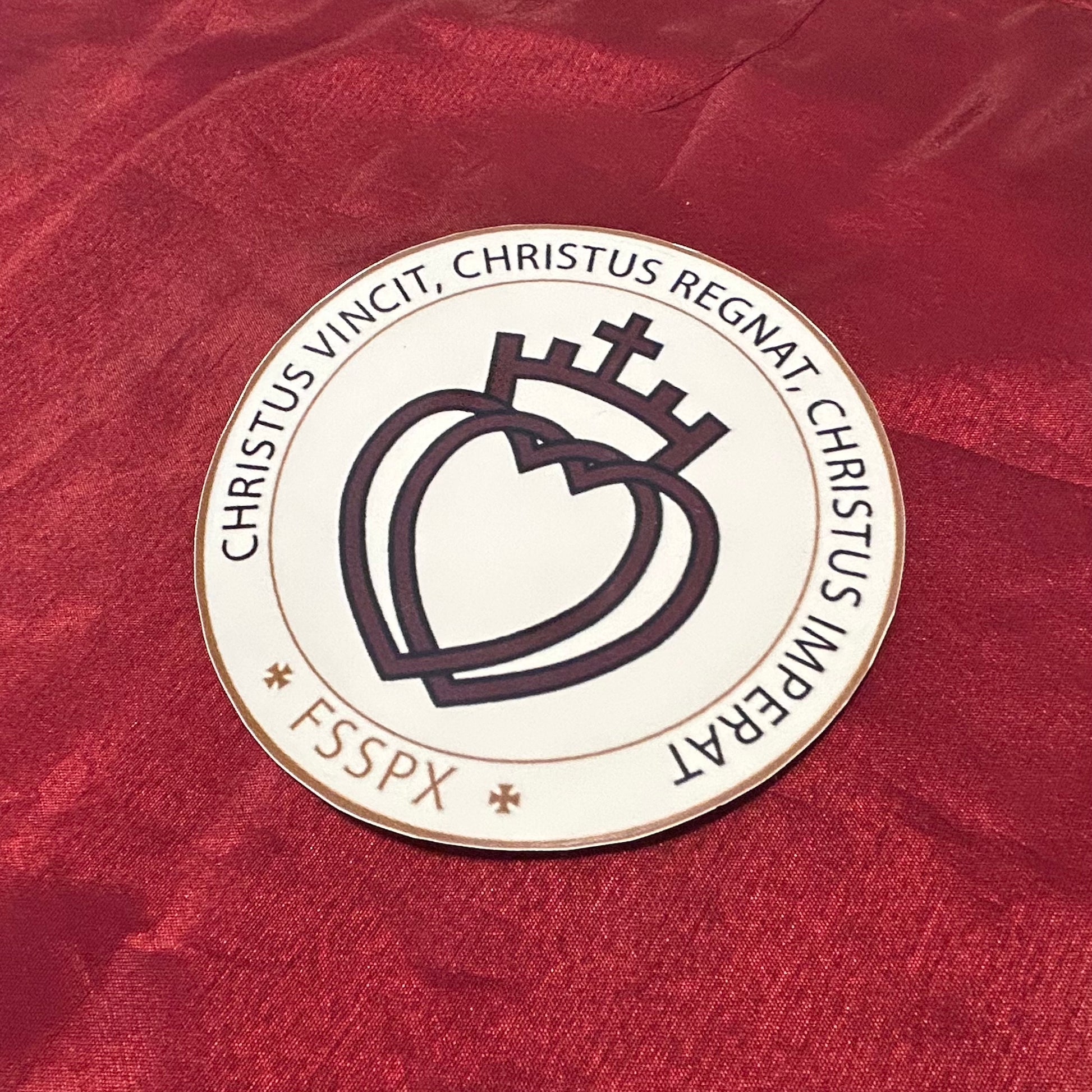This SSPX vinyl decal measures 4 5/8 " in diameter. The sticker prominently features the Vendean insignia, the united Hearts of Jesus and Mary, adopted by the SSPX as their logo. Hearts are dark maroon color. Great for cars, windows, laptops, etc.